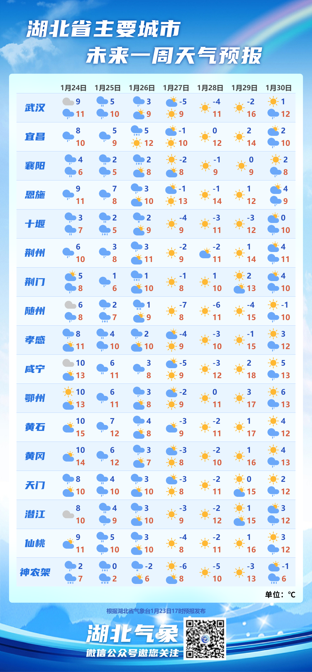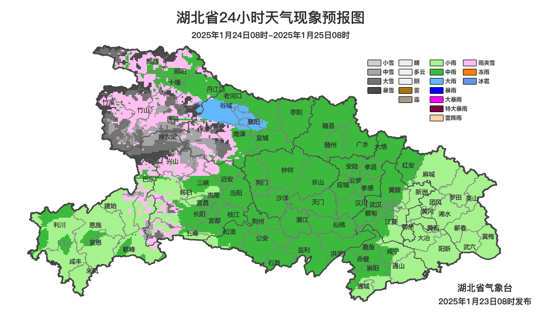 雨雪: 24-26日全省小到中雨,局部大雨,西部和北部有雨夾雪或雪(高山地區中到大雪、局地暴雪)。預計24-25日上午前,降雪區主要位於鄂西北,25日下午開始逐漸向東擴。26日南部還有小雨雪殘留,其他地區陰天轉多雲。