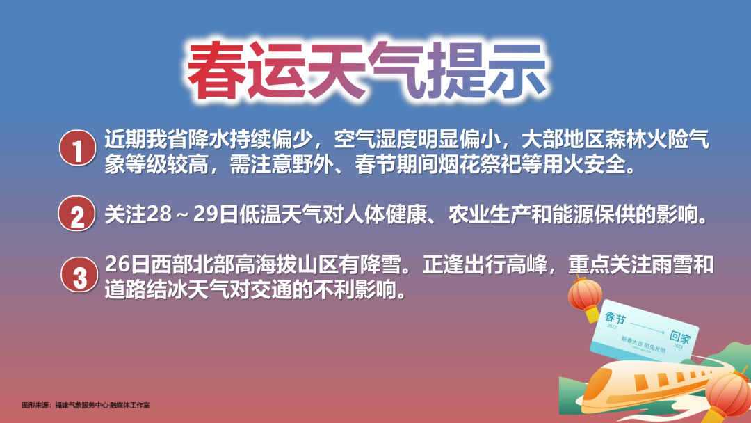 關注1月25日至26日和1月30日至2月1日降水和低能見度天氣對交通的不利影響,重點關注26日我省西北部高海拔山區雨雪天氣和道路結冰對春運的不利影響。