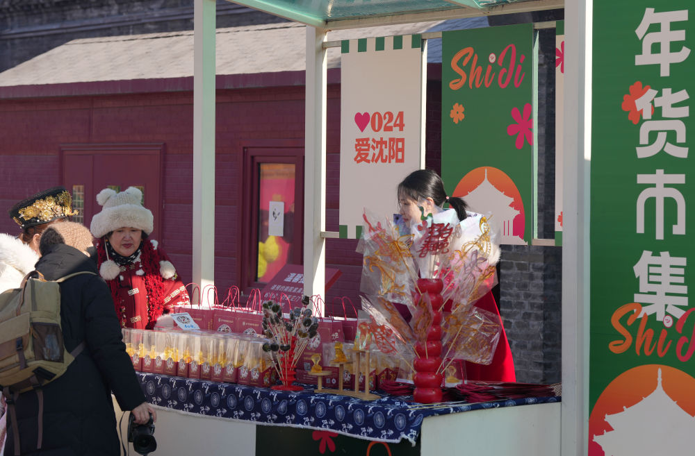 2025年1月22日,遊客在瀋陽故宮非遺年貨市集遊覽消費。
