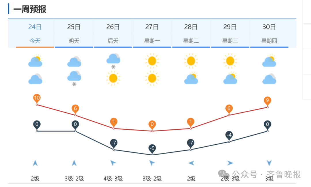 24日白天到夜間,菏澤、濟寧和聊城天氣陰局部有小雨轉多雲,其他地區天氣晴間多雲。北風短時南風3~4級。夜間最低氣温:魯南地區1°C左右,其他地區-2°C左右。最高氣温:菏澤、聊城和半島地區7°C左右,其他地區9°C左右。