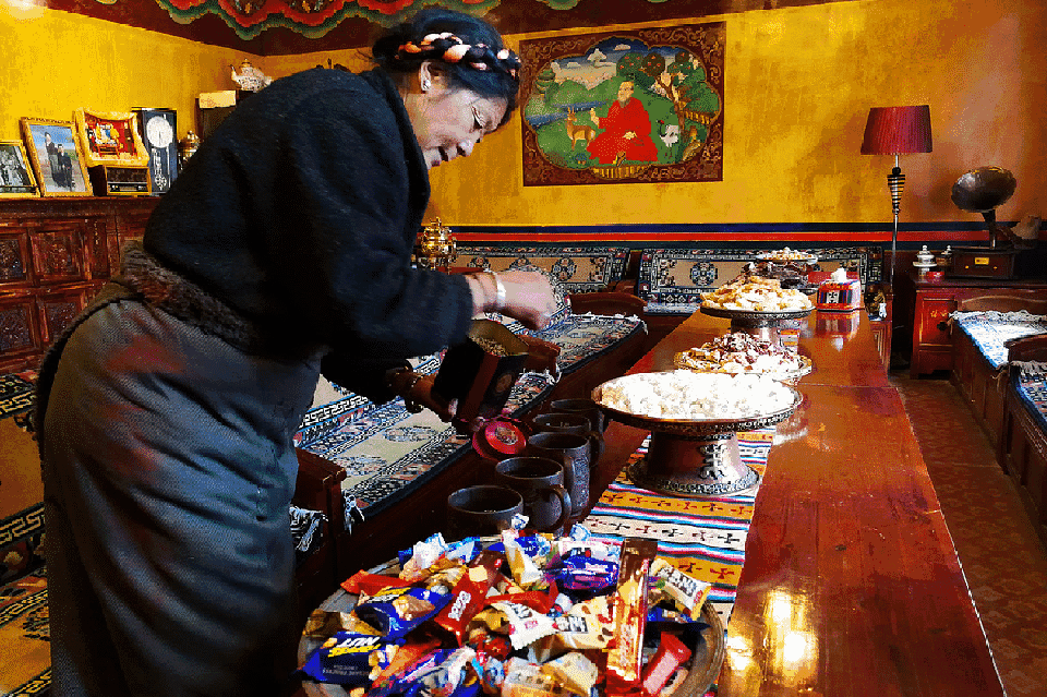 節日期間,藏式糕點也紛紛登場。“推”是其中的代表,這是一種用酥油、紅糖、奶渣和麪粉製成的糕點。酥油的醇厚、紅糖的香甜和奶渣的獨特口感完美融合在一起。製作“推”時,主婦們手法嫺熟,精心塑形,將對新年的祝福都揉進這小小的糕點裏。走親訪友時,一盤盤“推”被端上桌面,傳遞着濃濃的情誼。還有藏式血腸,堪稱新年餐桌上的硬菜。新鮮的羊血混合着剁碎的羊肉和香料,灌入洗淨的羊腸,煮熟後,色澤誘人。吃的時候,搭配上青稞酒,咬上一口,鮮香在舌尖散開,盡顯高原美食的豪邁。
