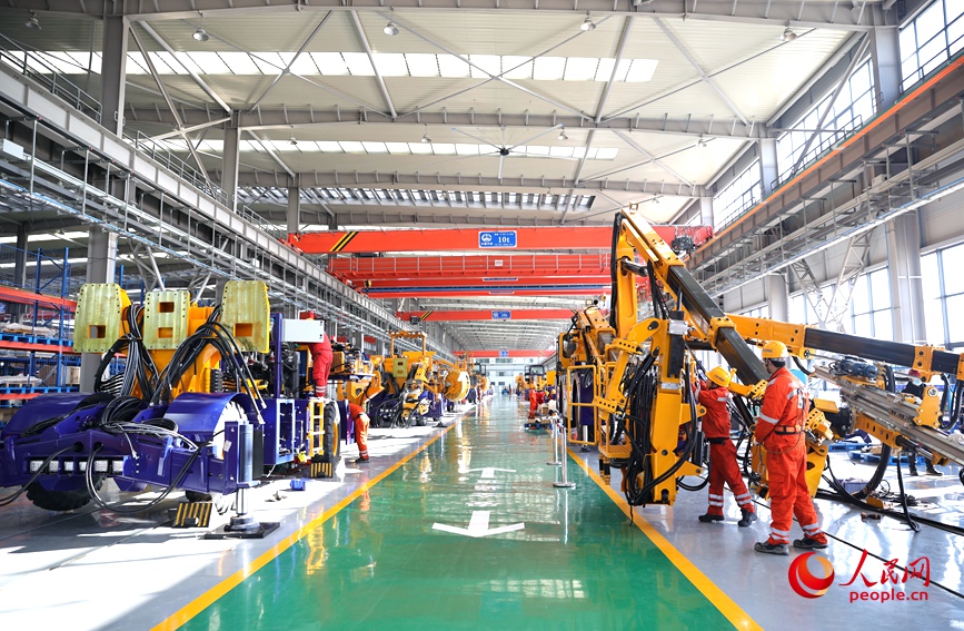 生產車間裏,工作人員在生產線上穿梭忙碌,多台專用設備正在緊張總裝中。人民網 宋芳鑫攝