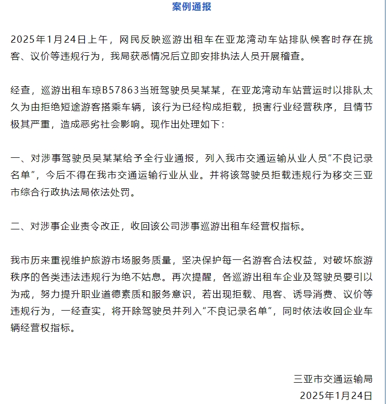 2025年1月24日上午,網民反映巡遊出租車在亞龍灣動車站排隊候客時存在挑客、議價等違規行為,我局獲悉情況後立即安排執法人員開展稽查。