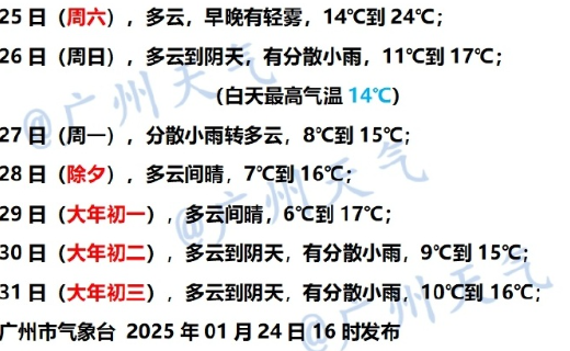 1月24日—25日,廣東西部市縣有小雨,其餘市縣多雲為主,大部分市縣和我省中西部海面有(輕)霧。最低氣温:粵北市縣10~13℃,粵西、珠江三角洲南部市縣16~19℃,其餘市縣13~16℃。