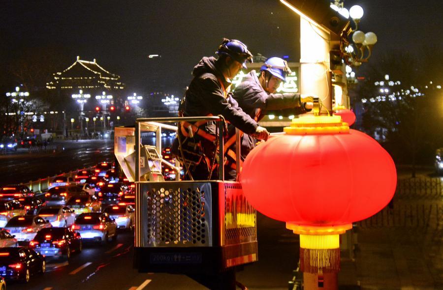 國網北京電力城市照明管理中心的技術人員在調試北京長安街上的大紅燈籠(2025年1月20日攝)。新華社記者李欣 攝