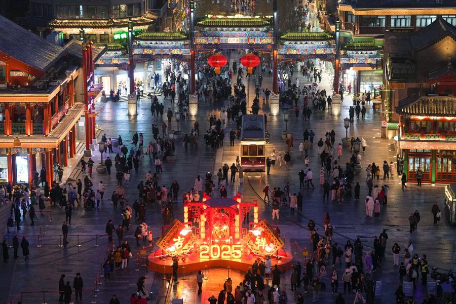 市民遊客在佈置了春節景觀的北京前門大街參觀遊覽(2025年1月22日攝)。新華社記者鞠煥宗 攝