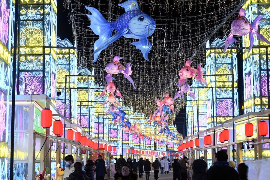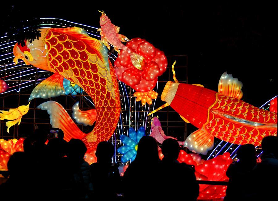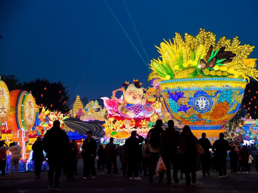遊客在寧夏銀川花博園山海燈會參觀遊覽(2024年12月20日攝)。新華社記者王鵬 攝