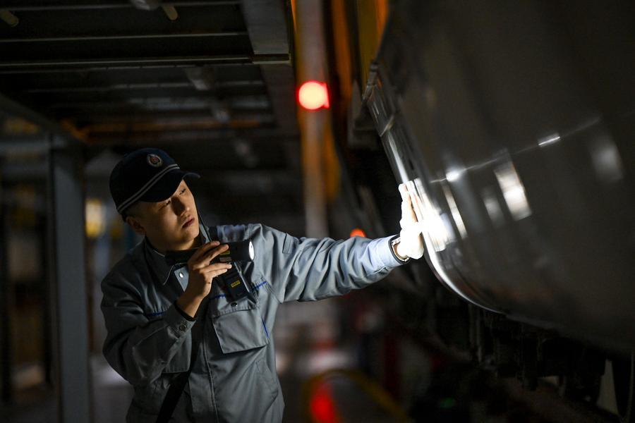 在中國鐵路呼和浩特局集團有限公司包頭車輛段呼和浩特東動車所內,工作人員對動車組車身兩側進行檢查(2025年1月17日攝)。新華社記者連振 攝