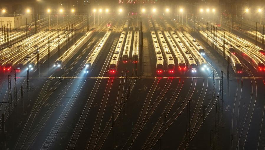 春運首日,動車組列車在鐵路天津動車客車段動車運用所停車場整裝待發(2025年1月14日攝,無人機照片)。新華社記者李然 攝