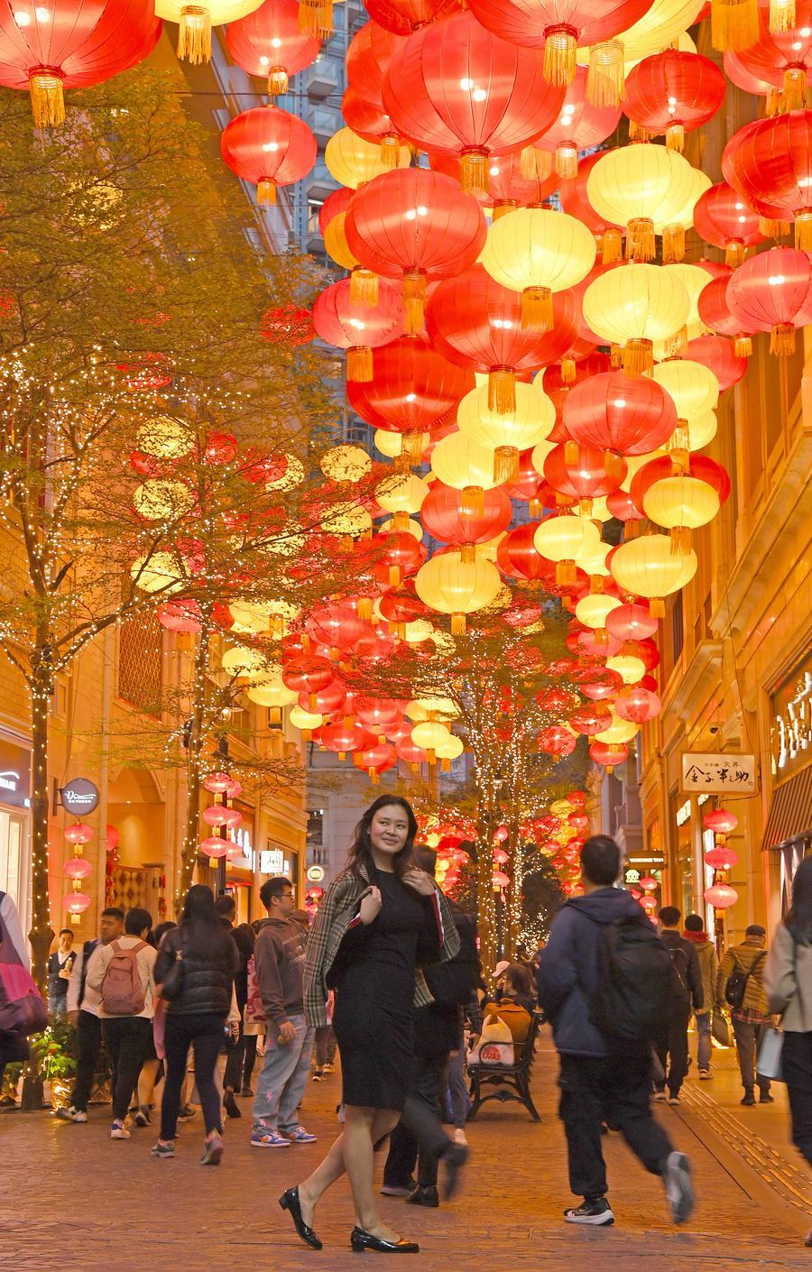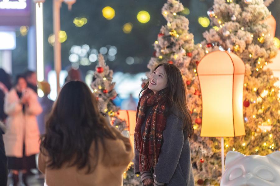 遊客在重慶市江北區觀音橋商圈景觀裝置前留影(2025年1月13日攝)。新華社記者黃偉 攝