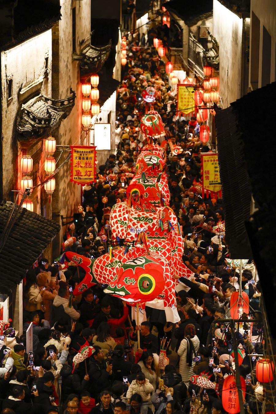 安徽省黃山市歙縣北岸鎮瞻淇村,村民舞動非遺魚燈,吸引了眾多遊客(2024年12月31日攝)。新華社發(施亞磊攝)