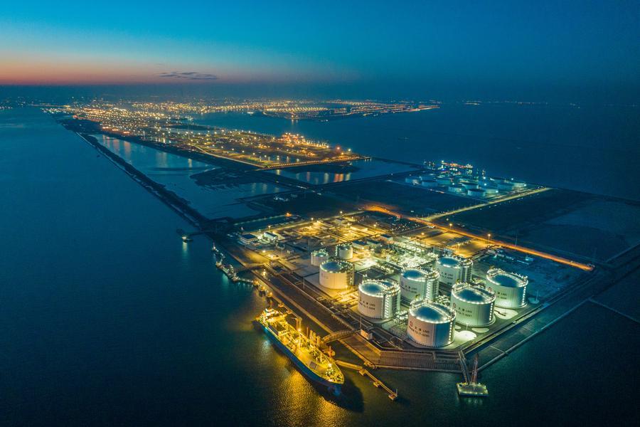 夜幕下的國家管網天津LNG接收站(2025年1月3日攝,無人機照片)。新華社發(杜鵬輝攝)