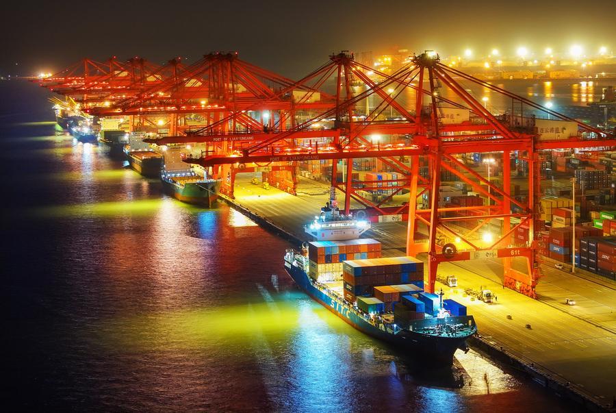 燈火通明的江蘇省連雲港港集裝箱碼頭(2024年12月14日攝,無人機照片)。新華社發(王健民攝)