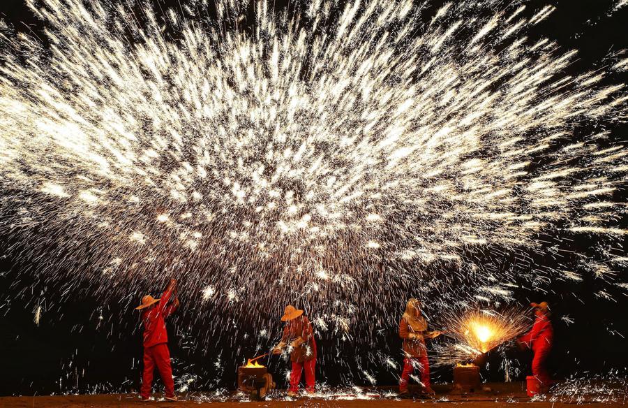 河南省洛陽市孟津區,非物質文化遺產項目寒水村夏氏打鐵花傳承人表演打鐵花(2025年1月3日攝)。新華社發(張光輝攝)