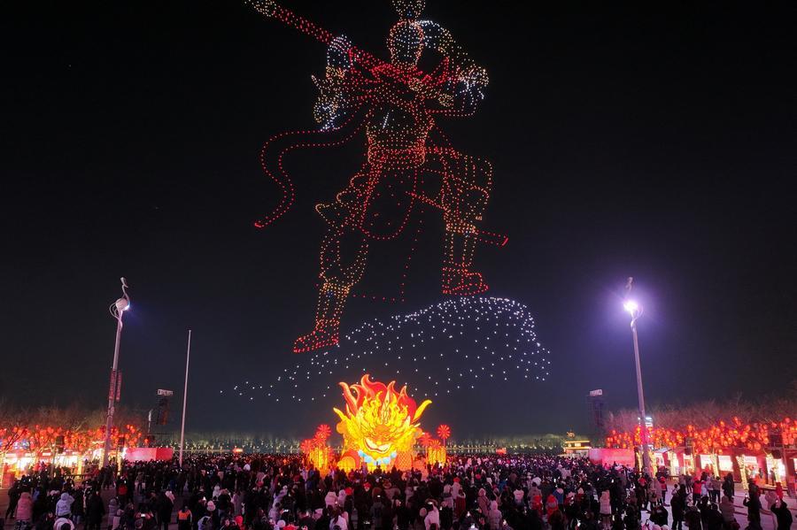 市民在河北省唐山市的唐山南湖春節燈會上觀看無人機表演(2025年1月22日攝,無人機照片)。新華社記者楊世堯 攝