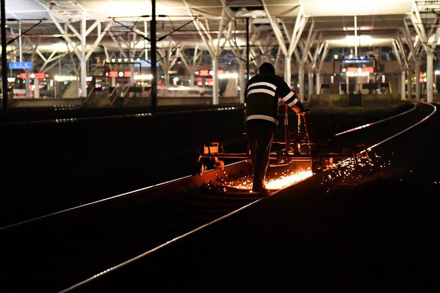 長沙高鐵工務段線路工在長沙南站滬昆場打磨鋼軌(2025年1月16日攝)。新華社記者陳振海 攝