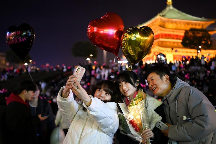 遊客在西安鐘樓合影留念(2024年12月31日攝)。新華社記者鄒競一 攝