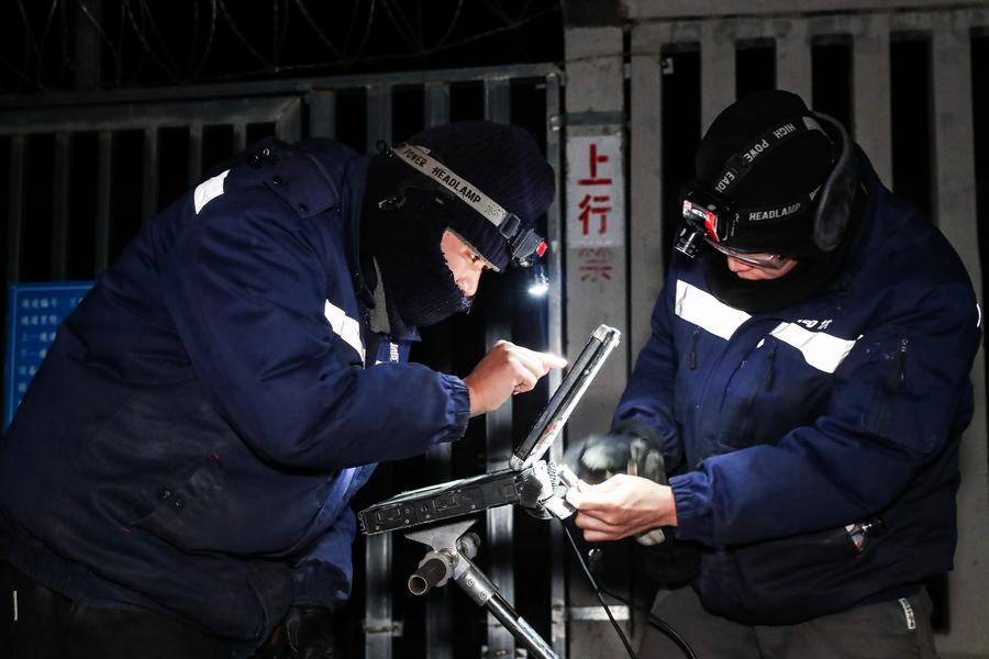 在甘肅省武威市的蘭張高鐵新烏鞘嶺隧道通道門外,兩名線路工組裝鐵路軌道檢查儀(2025年1月13日攝)。新華社記者郎兵兵 攝