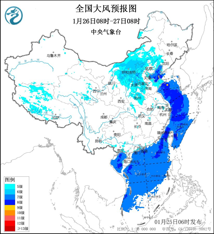 1月26日08時至27日08時,內蒙古中部、西藏西部、青海中東部、寧夏北部、陝西北部、山西、河北西北部和南部、北京西部、河南中東部和北部、山東東部、遼寧西部等地有5~7級、陣風8~9級的大風;渤海、渤海海峽、黃海中部和南部海域、東海大部海域、台灣海峽、台灣以東洋麪、南海大部海域、北部灣將有7~8級、陣風9級的大風,其中渤海東部和黃海中部部分海域風力可達9級、陣風10級。