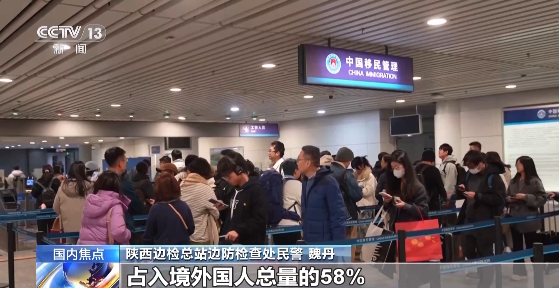 陝西邊檢總站邊防檢查處民警 魏丹:春運開啓至今,從西安機場口岸入境外國人已超過3100人次,較去年春運同期增長187%,其中免簽入境1800餘人次,佔入境外國人總量的58%。