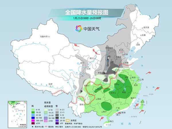 今天(1月25日)至27日,今年首場寒潮天氣過程繼續影響我國,中東部雨雪天氣仍處於鼎盛階段,並將向東鋪展,華北、東北等局地有強降雪。同時中東部更多地區將迎來顯著降温,北方多地累計降温幅度可達14℃以上,華北、黃淮部分地區最低氣温或低於零下10℃。正值春運高峯期,公眾請注意防寒保暖,雨雪天氣出行需留意交通安全。