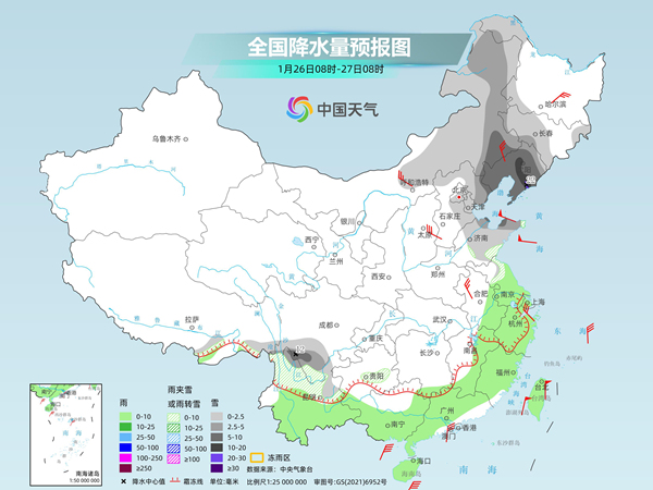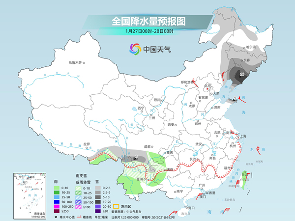 後天,內蒙古東北部、黑龍江西北部和南部、吉林、遼寧、山東半島、西藏東南部、川西高原南部、雲南北部、貴州西部等地部分地區有小到中雪或雨夾雪,其中,遼寧中東部、山東半島北部、川西高原南部等地部分地區有大雪,局地暴雪。西藏東南部、雲南西南部、四川東南部、貴州西南部、台灣島北部和東部等地部分地區有小雨。