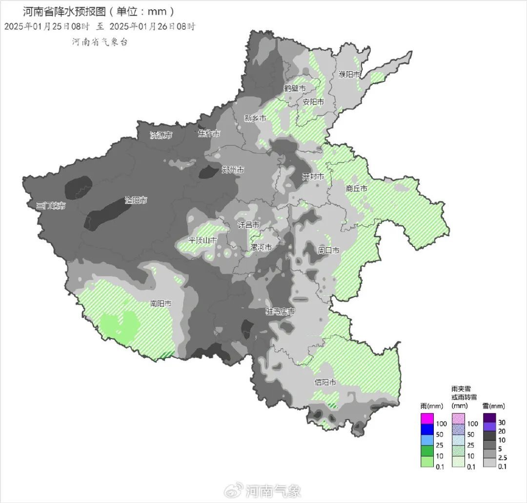 今天白天到夜裏,全省陰天,安陽、鶴壁、新鄉、焦作、濟源、三門峽、洛陽、鄭州西部、平頂山、南陽東北駐馬店西部有中到大雪,局部暴雪;其他縣市小到中雨轉雨夾雪或中到大雪。