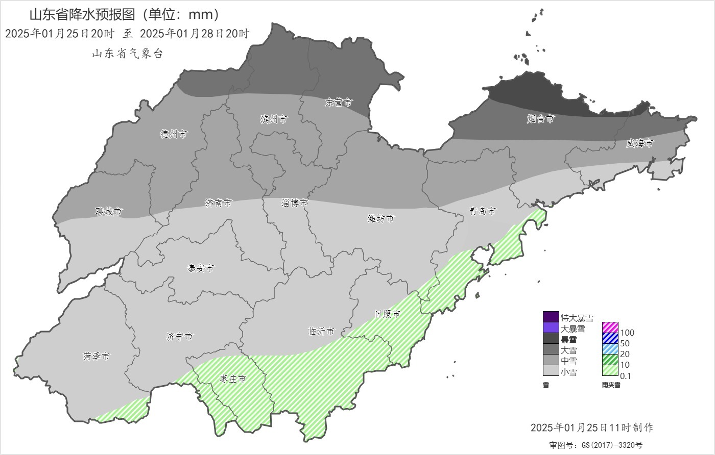 25日夜間至28日,山東省累積平均降水量2~4毫米,半島北部地區局部5~10毫米。其中,25日夜間至26日,菏澤、聊城、德州、濱州、東營、泰安、濟南和淄博天氣陰有雨夾雪轉小到中雪局部大雪,其他地區天氣陰有小雨或雨夾雪轉小雪;27至28日,煙台北部和威海天氣陰有中到大雪局部暴雪。