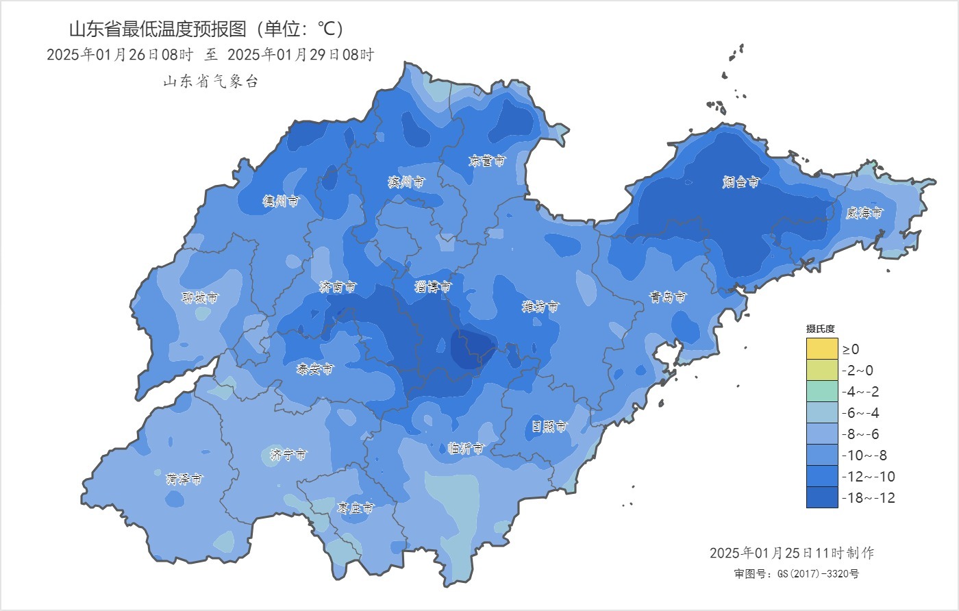 25日夜間至28日,山東省將出現寒潮天氣,大部地區氣温下降8℃~10℃。最低氣温出現在28日至29日早晨,魯西北、魯中和半島內陸地區-12℃~-9℃,其他地區-8℃~-5℃。降温同時伴隨雨雪和大風天氣,大部地區將產生對交通有影響的積雪和道路結冰。為此,山東省氣象台發佈了寒潮藍色、道路結冰黃色、海上大風橙色預警和雨雪預報。