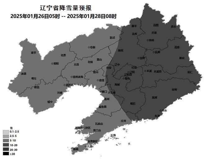 降雪方面,26日早晨至白天,大連東北部、鞍山東部、丹東西部、朝陽、葫蘆島地區有中雪到大雪(4~10毫米),局部有暴雪(10~18毫米),新增積雪深度3~8釐米;其他地區有小雪到中雪(1~3毫米),新增積雪深度1~3釐米。26日夜間至27日夜間,瀋陽中東部、大連東北部、鞍山、撫順、本溪、丹東、營口、遼陽、鐵嶺中南部地區和沈撫示範區有暴雪(10~20毫米),其中,鞍山中東部、本溪西南部、丹東西部、遼陽南部地區局部有大暴雪(20~30毫米),新增積雪深度8~20釐米;其他地區有中雪到大雪(3~10毫米),新增積雪深度3~7釐米。