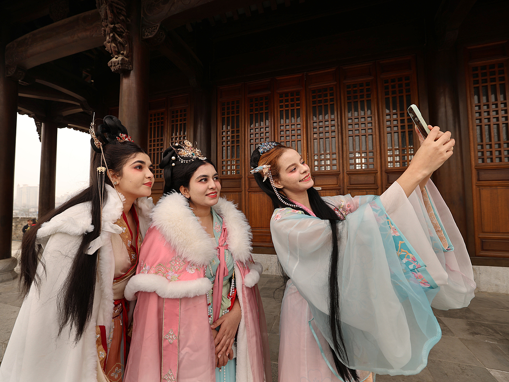 蛇年新春將至,中國出入境旅遊市場持續升温,大批外國遊客湧入,沉浸式感受中國春節的獨特魅力。相關平台數據顯示,春節期間入境遊訂單同比增長達203%。為了體驗中國傳統文化,外國朋友們不僅觀看舞龍舞獅等傳統年俗表演,還紛紛體驗“過年三件套”:穿漢服、寫福字、吃餃子。在西安大唐不夜城,到處可見金髮碧眼的外國人身着漢服,手提花燈,化中式妝造,沉浸式體驗千年古都的風情。他們還將自己穿漢服的視頻配上古風背景音樂,在社交平台上與親友分享,過足了穿越癮。“穿漢服在古城裏走着,我感覺自己像個古代的公主”,一位外國網友分享説。