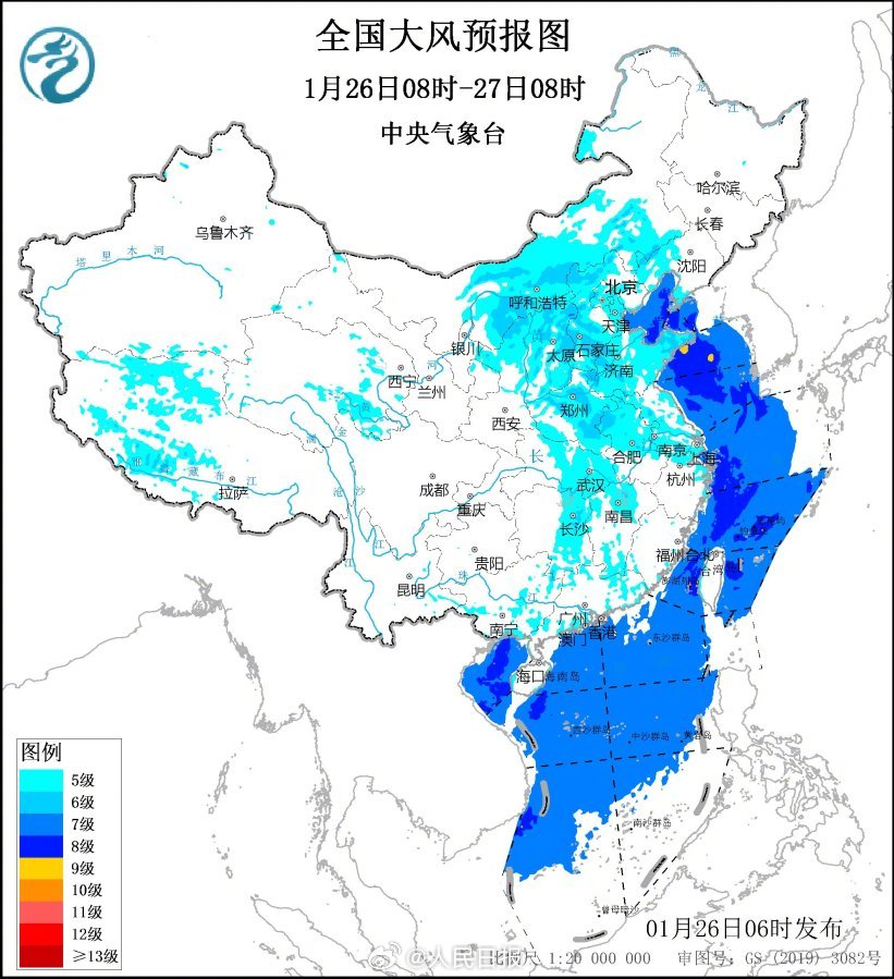 大風→預計,1月26日08時至27日08時,西藏中西部、青海東部、內蒙古中東部、陝西北部、山西、河北、遼寧西部和南部、北京、天津、山東、河南大部、湖北中東部、湖南東部、安徽中北部、江蘇大部、上海、浙江沿海、江西北部、廣西東部、廣東沿海等地部分地區將有5級左右偏北風、陣風7~9級。