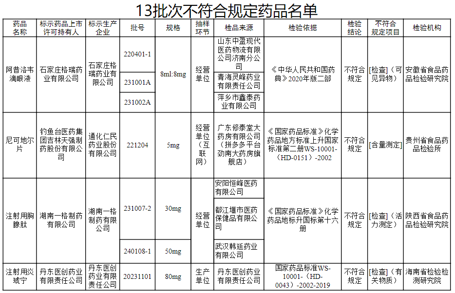 24日,國家藥監局發佈通告稱,經安徽省食品藥品檢驗研究院等7家藥品檢驗機構檢驗,*共10家企業生產的13批次藥品不符合規定。*現將相關情況通告如下: