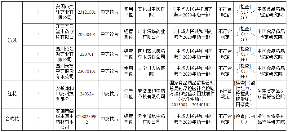五、經中國食品藥品檢定研究院檢驗,標示為安國市久旺藥業有限公司、江西齊仁堂中藥飲片有限公司、四川沱江源藥業有限公司、四川天植中藥股份有限公司生產的4批次防風不符合規定,不符合規定項目為水分。