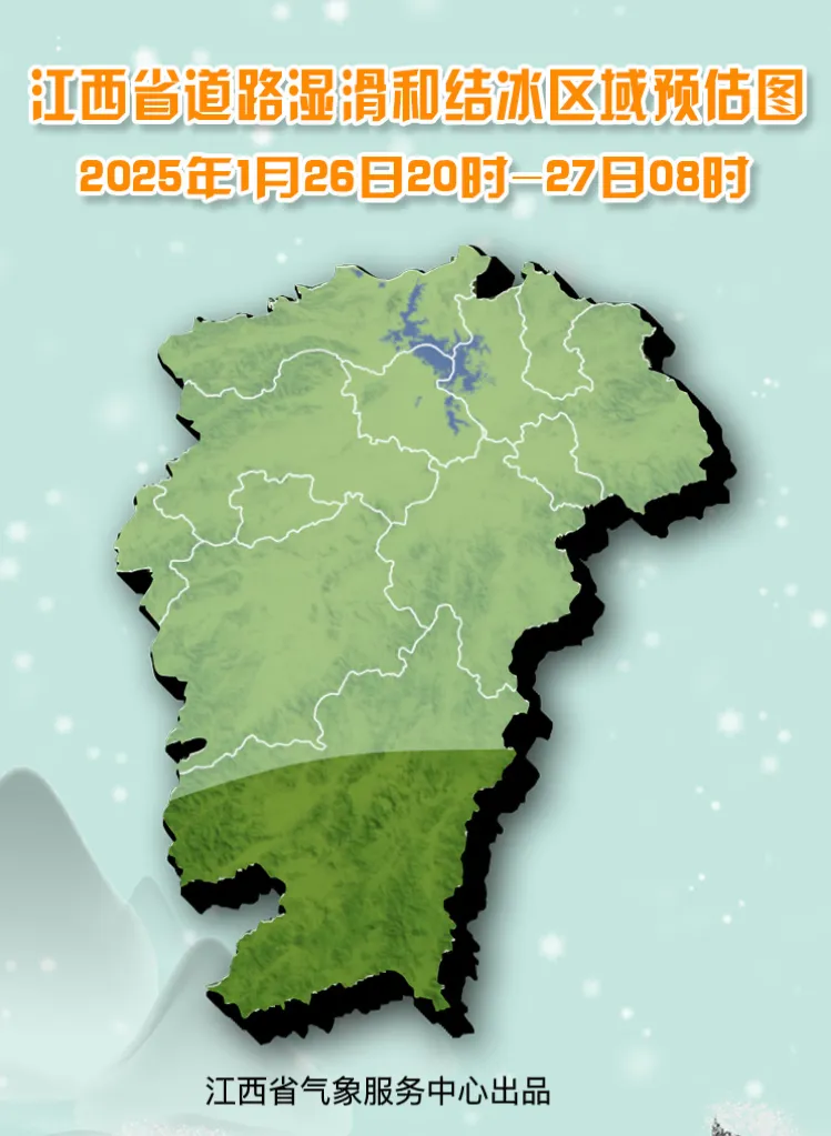 江西省氣象台2025年01月25日08時37分發布寒潮藍色預警信號:預計未來48小時內,全省氣温將下降9℃~12℃,27日早晨最低氣温贛北、贛中和贛南北部可降至零下2℃~0℃ ,山區零下4℃ ,贛南南部可降至0℃~2℃;偏北風力加大,25日夜間至26日江湖水面、平原河谷和高海拔山區偏北陣風可達7級,請注意防範。