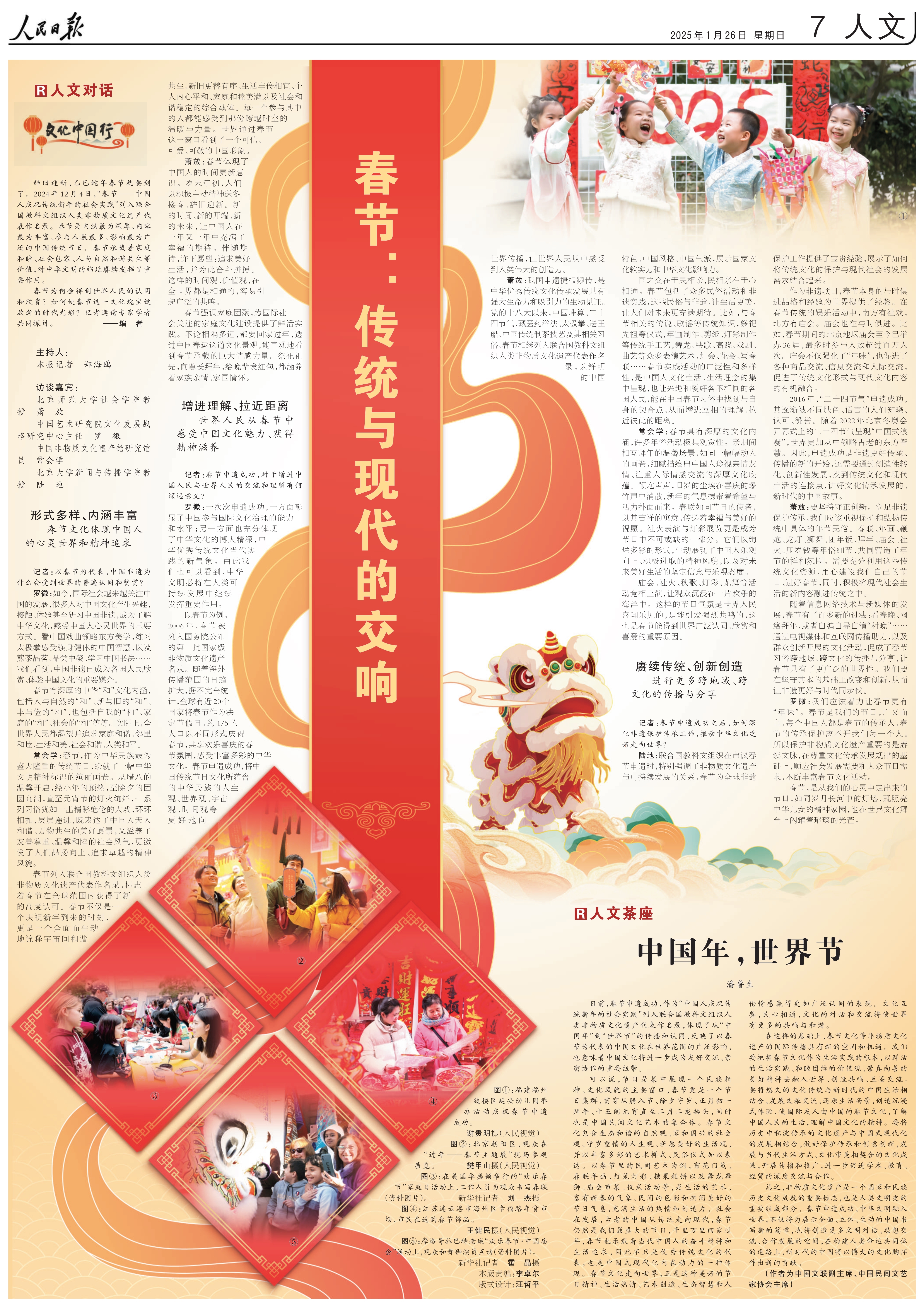 可以説,節日是集中展現一個民族精神、文化風貌的主要窗口,春節更是一個節日集羣,貫穿從臘八節、除夕守歲、正月初一拜年、十五鬧元宵直至二月二龍抬頭,同時也是中國民間文化藝術的集合體。春節文化包含生態和諧的自然觀、家和國興的社會觀、守歲重情的人生觀、祈願美好的生活觀,並以豐富多彩的藝術樣式、民俗儀式加以表達。以春節裏的民間藝術為例,窗花門箋、春聯年畫、燈籠燈綵、糖果糕餅以及舞龍舞獅、廟會市集、儀式活動等,是生活的藝術,富有新春的氣象、民間的色彩和熱鬧美好的節日氣息,充滿生活的熱情和創造力。社會在發展,古老的中國從傳統走向現代,春節仍然是我們最盛大的節日,千里萬里回家過年,春節也承載着當代中國人的奮鬥精神和生活追求,因此不只是優秀傳統文化的代表,也是中國式現代化內在動力的一種體現。春節文化走向世界,正是這種美好的節日精神、生活熱情、藝術創造、生態智慧和人倫情感贏得更加廣泛認同的表現。文化互鑑,民心相通,文化的對話和交流將使世界有更多的共鳴與和諧。