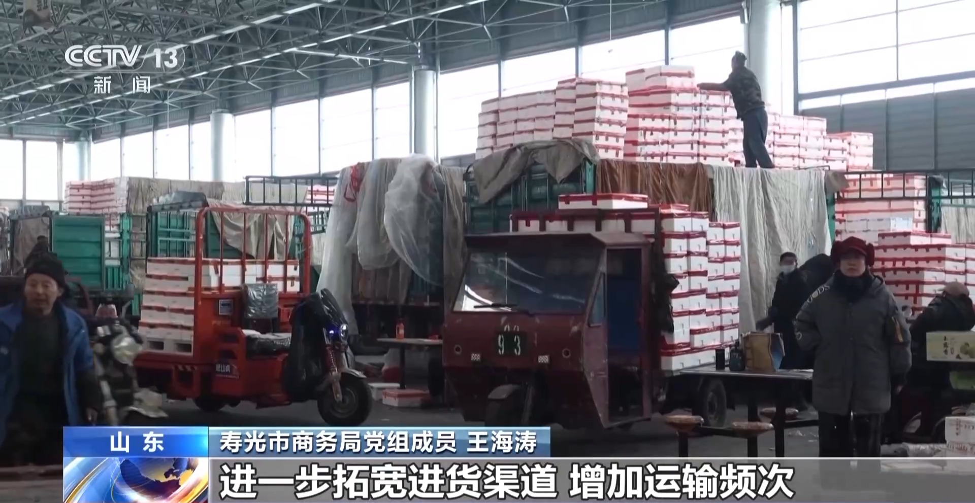 *壽光市商務局黨組成員 王海濤:*春節期間,預計壽光每天約有1.4萬噸蔬菜運往全國各地,我們現在正積極調運,加強與各地蔬菜產地及市場緊密合作,進一步拓寬進貨渠道、增加運輸頻次,確保蔬菜不斷檔,不脱銷,供應充足。