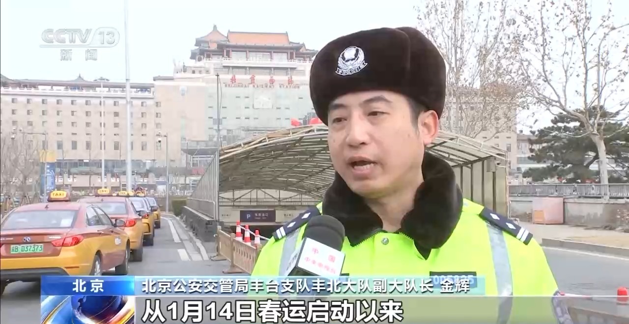 北京公安交管局豐台支隊豐北大隊副大隊長 金輝:從1月14日春運啓動以來,西站南北廣場一直處在高位運行階段,特別是每日的上午十點到下午三四點鐘是高峯期。我們也啓動了高等級上勤方案,民警24小時在崗在位,保證車輛的順序通行。