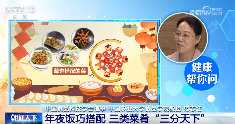 中國食品科技學會理事、中國農業大學食品學院教授範志紅稱:“我建議大家把年夜菜分成三個類別。第一個類別就是那些傳統的硬菜,比如説有些地方講究一定要吃四喜丸子,一定要吃一條魚,年年有餘。第二類菜,我們建議食用葷素搭配的菜,葷不一定非得是肉,我們可以選擇各種水產品,而且肉裏我們也可以換換花樣,就不全是豬肉了,它可以是牛肉、雞肉、鴨肉、鵝肉等等。我們再搭配一些素食,比如説一些新鮮的蔬菜,特別是一些時令的材料,然後可以配一些菌類。第三類菜叫平衡菜,平衡什麼?平衡那些大魚大肉和高脂肪高膽固醇的。這樣的菜基本上是純素,比如説我們可以放一些大拌菜一類的,各種蔬菜水果放在一起,又比如説青菜可以做一些清炒的、白灼的、涼拌的、蒸的或者是水油燜的等等,放的油都非常少,但是口感還非常鮮嫩。這三類菜餚可以各佔三分之一,所以我們就叫三分天下,健康餐桌。”
