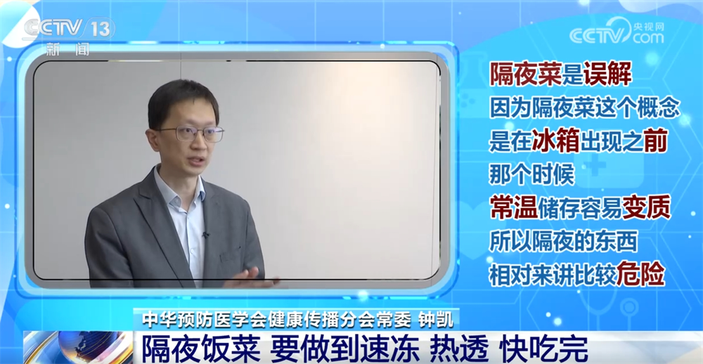 中華預防醫學會健康傳播分會常委鍾凱稱:“關於隔夜菜這個問題其實是一個非常大的誤解,因為隔夜菜這個概念本身出現是在冰箱出現之前,那個時候常温儲存是容易變質的,所以隔夜的東西確實相對來講會比較危險。有了冰箱是完全不一樣的概念,在冰箱當中,微生物的生長繁殖是被壓制的。首先第一條就是迅速降温,可以稍微趁它有點温熱的時候放冰箱迅速降温。第二個就是熱的時候一定要熱透,熱透的概念是説中心的温度達到70攝氏度,你可以用筷子試一試裏面是不是已經燙了,不要外面是熱的,裏面是涼的,熱透再吃沒有問題。第三個,不管冰箱有多麼安全,它都不是保險箱,剩菜剩飯要儘快吃掉,一般來講一兩天之內吃掉問題不大。”