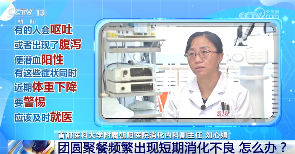 首都醫科大學附屬朝陽醫院消化內科副主任劉心娟稱:“比如我吃多了,吃完沒運動,短期內出現的這種腹脹、早飽、噯氣或者甚至有點噁心想吐這些症狀,可以先吃點藥,先吃點消化酶類的藥物。比如説除了這些腹脹、早飽、噯氣這些症狀,可能有的人會嘔吐,嘔吐的胃內容物不是食物,可能會有點咖啡色的物質,或者出現了腹瀉,大便潛血是陽性,這些病人有了這些症狀的同時,近期感覺到體重有下降,這樣的時候我們就要警惕了,不要單純吃點酶、自己吃點藥,還是應該及時就醫的。”