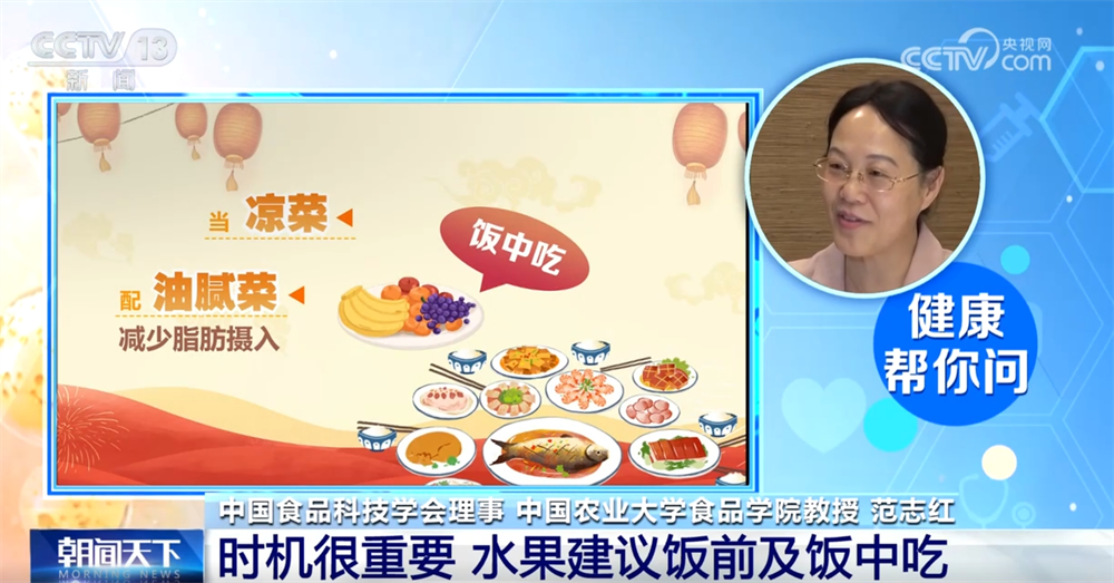 範志紅稱:“如果我們吃水果,飯後去吃,已經吃得非常飽了,再加很多水果,就是額外增加身體的負擔。我這裏特別提倡大家飯前吃或者飯中吃。飯前吃可以平穩餐後血糖,用餐的時候吃有個什麼好處?它就當涼菜了,那就可以跟那些油膩的菜配在一起,使你這一餐當中攝入的脂肪減少。我給大家推薦一下,如果你吃了紅燒牛肉,然後配一個蘋果丁,你會覺得特別爽口,這兩個東西在一起簡直太搭了,會造出一種單吃的時候沒有的美味。”