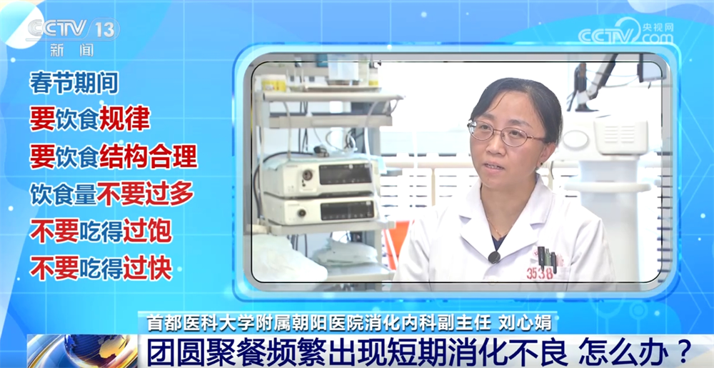 劉心娟稱:“所以在春節期間,我們在飲食上還是要儘量規律,飲食的結構儘量合理,飲食量也不要過多,不要吃得過飽,也不要吃得過快。另外,飲酒還是要適量。我們也可以吃完飯到户外去活動,這樣都可以減少消化不良症狀的發生。”