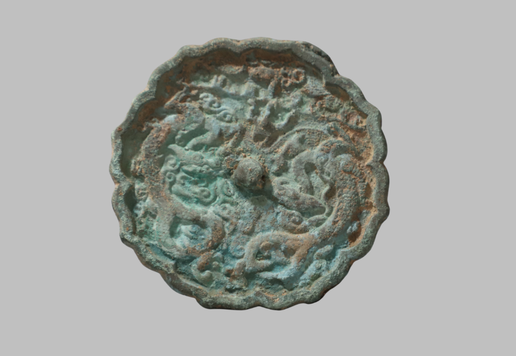 阿爾寨石窟遺址6號建築基址出土的銅鏡。新華社發