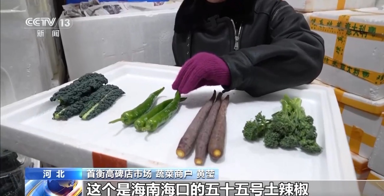 *首衡高碑店市場 蔬菜商户 黃瑩:*這裏有雲南的甜杆西蘭薹、雲南大理的紫玉手指胡蘿蔔、海南海口的五十五號土辣椒、湖北武漢的皺葉菜。皺葉菜在南方也是新品,目前是同步供應,因為南方一旦有了新品,我們都是第一時間帶過來的。