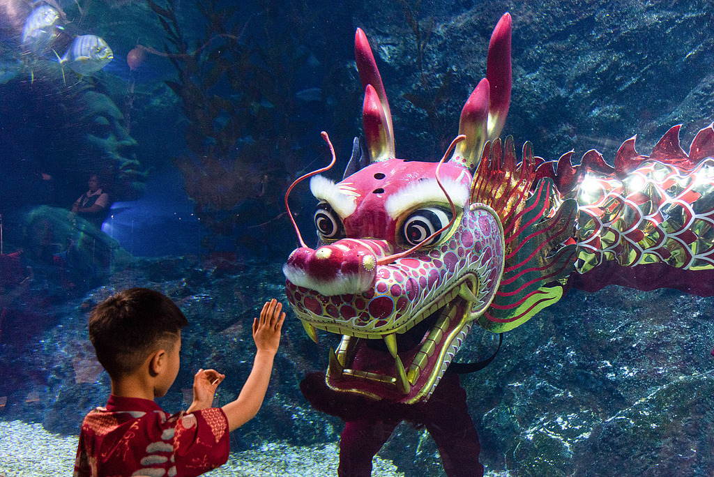 新春將至,在華人眾多的東南亞,“新”年味也越來越濃。位於泰國曼谷的暹羅海洋世界近日開啓迎新年活動,4名潛水員在鯊魚和其他魚類的包圍下表演“水下舞龍”,還與水箱外的舞獅表演互動。遊客們被這場創新的表演吸引,紛紛駐足拍照。有遊客感嘆道:“我去過很多水族館,但沒有一個有這樣的文化活動,水下舞龍非常有創意。”一名潛水員表示:“今年用於表演的龍與往年相比更長更大,為了讓這次表演更加精彩,我們做了更多改進。”不只是泰國,新加坡聖淘沙海洋館和印尼雅加達安科爾海洋世界同樣開啓了水下舞獅舞龍表演,迎接春節的到來。