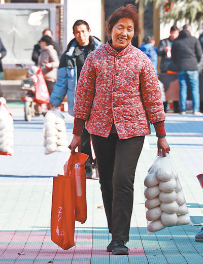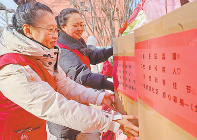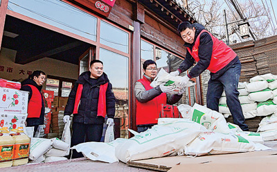 山東省青州市,工作人員將走訪慰問困難羣眾的愛心年貨裝車。