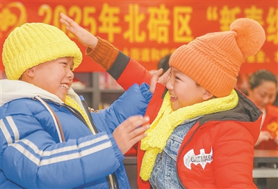 重慶市北碚區水土街道和悦家園社區,困境兒童穿戴着志願者贈送的帽子和圍巾在玩耍。