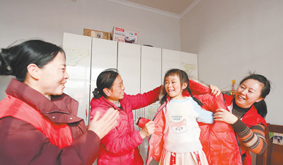 安徽省金寨縣燕子河鎮張畈村,志願者在困難羣眾家裏幫助孩子試穿新衣服。
