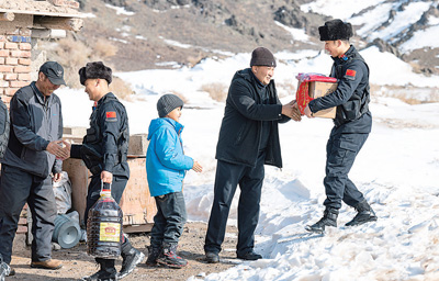 新疆維吾爾自治區昌吉回族自治州木壘哈薩克自治縣,昌吉邊境管理支隊大黃水泉邊境派出所民警給偏遠牧民送年貨。